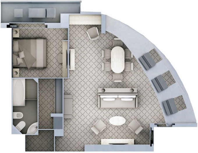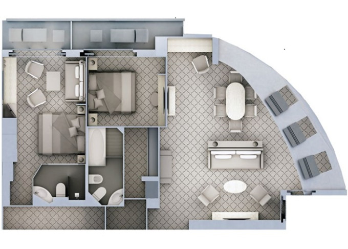 | R2 - Royal Suite 2 79,5 m² + balkóny 16,5 m. Royal Suite R1 spojená s Veranda Suite. 6. paluba - vpredu. Max 5 osôb. | 94 000 € 94 000 € za osobu |