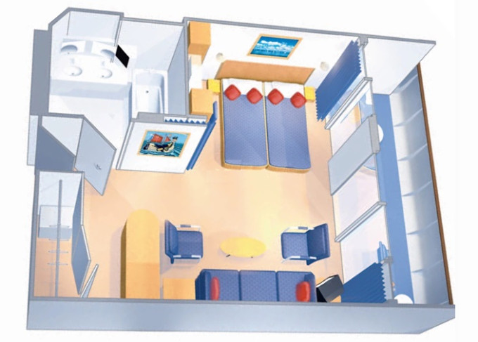 1K - Veľká vonkajšia kajuta Ultra Spacious 24,5 m². Neotvárateľné okno. 7/8. paluba. Oddelená časť s poschodovou posteľou. Max 5-6 osôb. 4 184 € 1 046 € za osobu