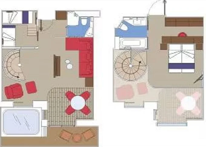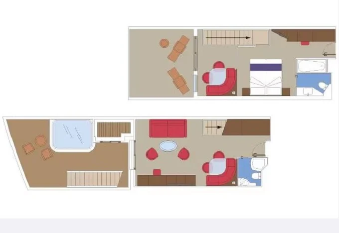 | YJD - Yacht Club Duplex Suite s vírivkou 46 m² + balkón 30 m². Vírivka. 2 podlažia, šatník, 2 kúpeľne (1 s vaňou). Max 4 osoby. 16. paluba. Cenový model MSC Yacht Club. | 7 950 € 7 950 € za osobu |